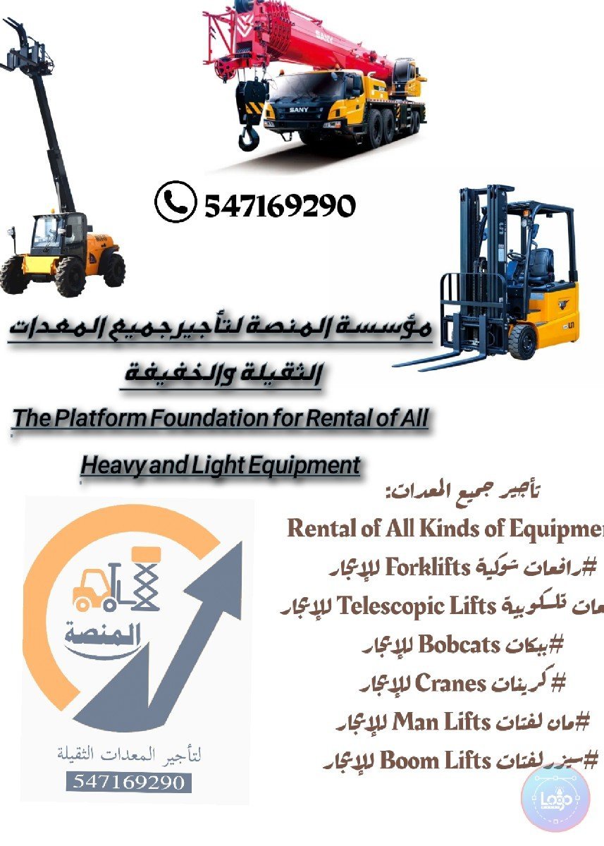 روافع شوكية للإيجار #رافعات شوكيه للإيجار Forklifts for Rent روافع تلسكوبية للإيجار #رافعات تلسكوبية للإيجار Telescopic Lifts for Rent رافعات هيدروليكية للإيجار Hydraulic Lifts for Rent روافع مقصية للإيجار Scissor Lifts for Rent روافع يدويه للإيجار Manual Lifts for Rent سيزر لفتات للإيجار Boom Lifts for Rent سيزرات للإيجار Boom Lifts for Rent مان لفت للإيجار Man Lifts for Rent مان لفتات للإيجار Man Lifts for Rent بومات للإيجار Bobcats for Rent كرين للإيجار Cranes for Rent جميع المعدات الثقيلة والخفيفه للإيجار All Heavy and Light Equipment for Rent الرياض تأجير معدات ممتازة جديده بسرعة عالية وبأقل وقت Riyadh Excellent New Equipment Rental with High Speed and Least Time تأجير يومي اسبوعي شهري سنوي تأجير بسائقين او بدون سائقين