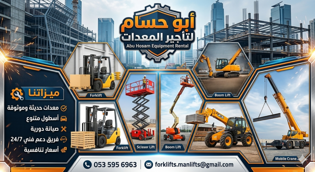 مؤسسة الرافعات الحديثة لتأجير المعدات الثقيلة والخفيفة ⭐⭐ Modern Lifting Equipment Est. for Heavy & Light Equipment Rental نقدم حلول رفع ومناولة متكاملة بأعلى معايير الجودة والسلامة، من خلال أسطول حديث ومتجدد من المعدات الثقيلة والخفيفة لخدمة المشاريع الصناعية والإنشائية واللوجستية. We provide integrated lifting and material handling solutions with the highest standards of quality and safety, supported by a modern fleet serving industrial, construction, and logistics projects. 🚜 الرافعات الشوكي