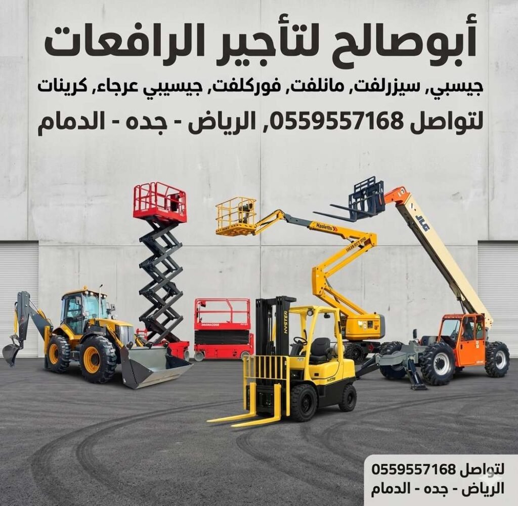 معلومات التواصل ​رقم الجوال: 0559557168 ​نطاق الخدمة: الرياض، جدة، والدمام. ​أنواع الرافعات والمعدات المتاحة ​تتوفر مجموعة متنوعة من المعدات الثقيلة المناسبة لمختلف التضاريس والاحتياجات الإنشائية: ​سيزر لفت (Scissor Lift): رافعات مقصية للعمل في الأماكن المرتفعة. ​مان لفت (Man Lift): رافعات ذراعية مفصلية وتلسكوبية. ​فوركلفت (Forklift): رافعات شوكية لتحميل ونقل البضائع. ​كرينات (Cranes): أوناش متحركة لرفع الأوزان الثقيلة. ​جيسيبي (JCB): معدات حفر وتحميل متعددة الاستخدامات. س[!NOTE] الصور توض