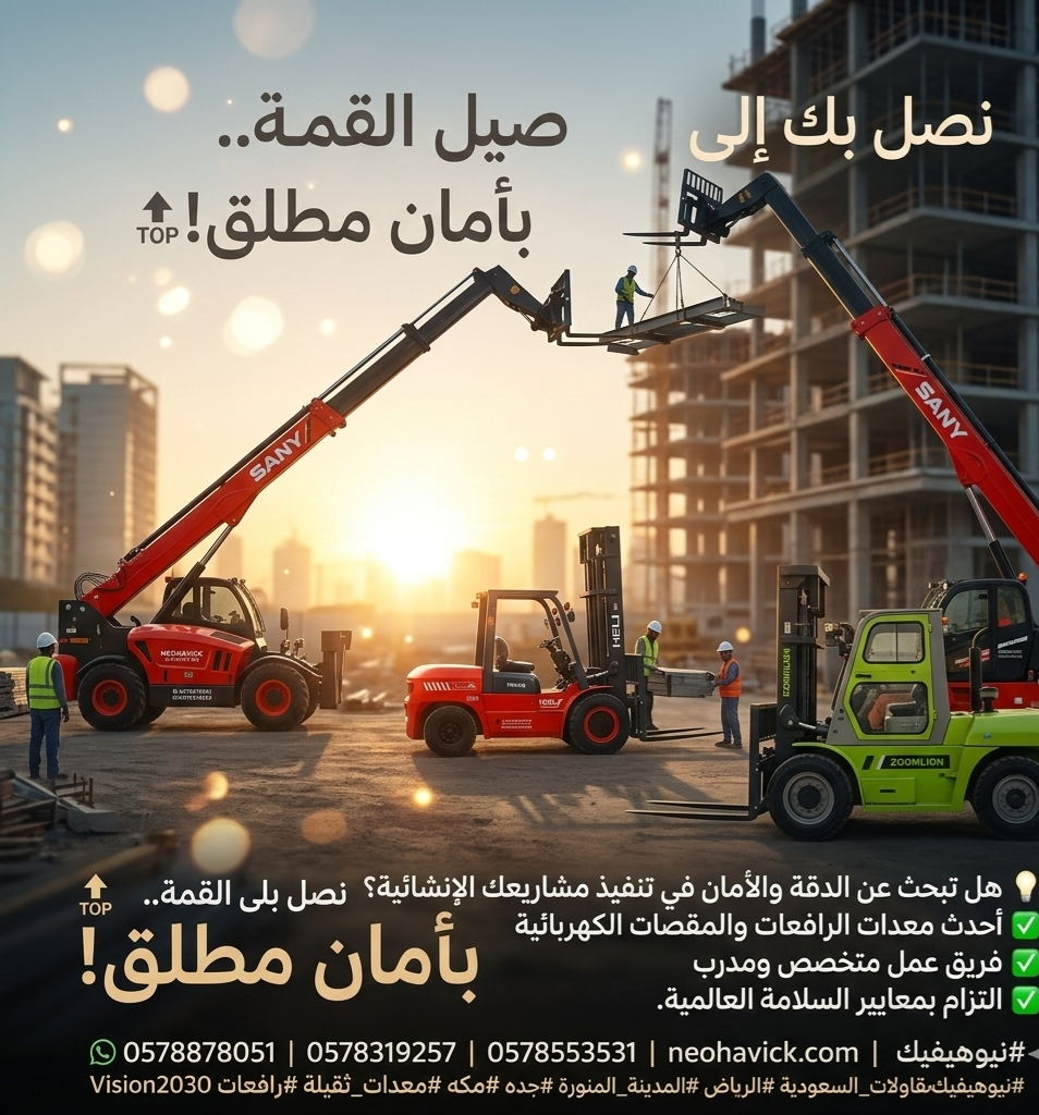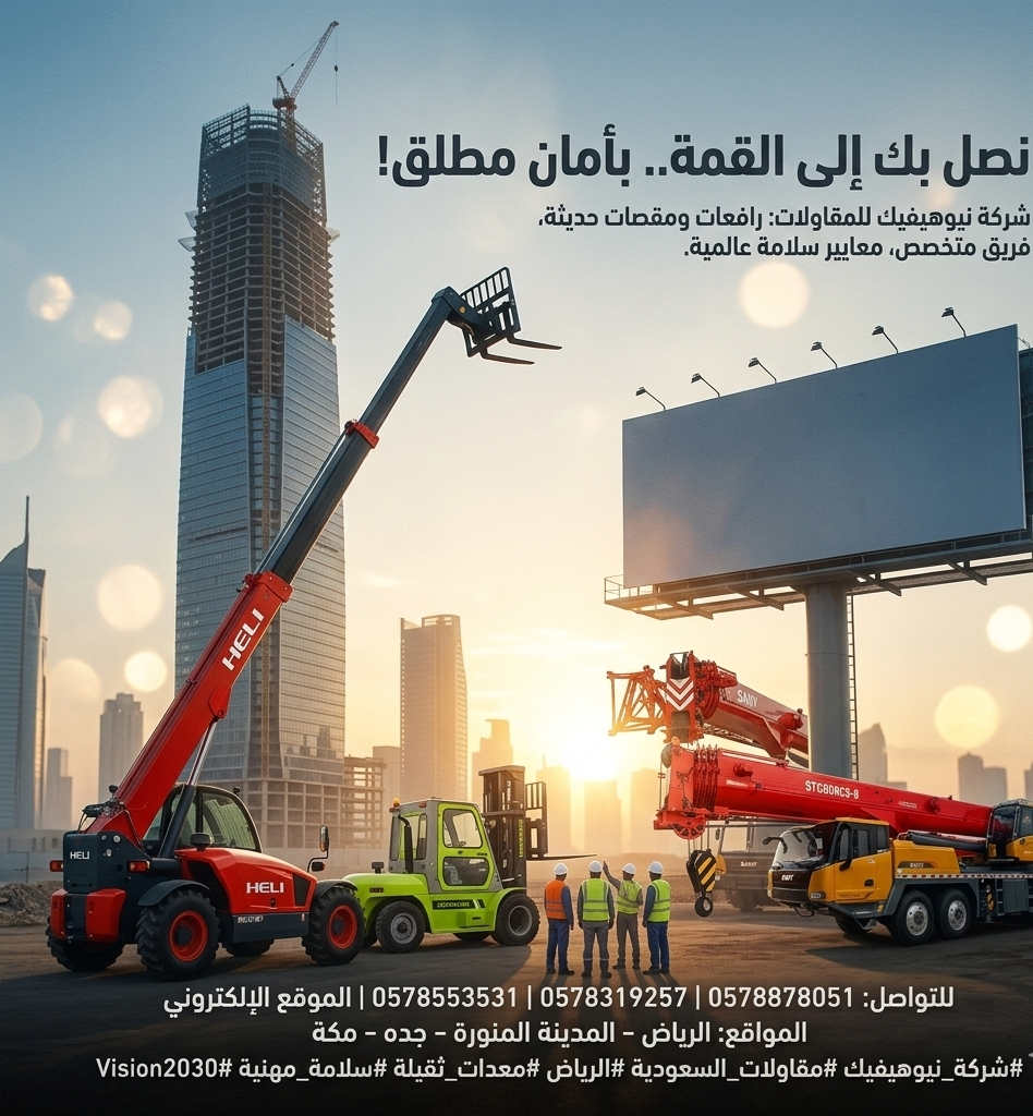 نصل بك إلى القمة.. بأمان مطلق! 🔝 ​في شركة نيوهيفيك للمقاولات، نؤمن أن المشاريع العملاقة تتطلب دقة متناهية ومعايير سلامة لا تقبل المساومة. نوفر أحدث الرافعات والمعدات التي تضمن سير العمل في أصعب المواقع وأكثرها ارتفاعاً بكفاءة واحترافية عالية. ​ثقتكم هي وقودنا للوصول إلى أعلى القمم. 🛠️👷‍♂️ ​💡 الخيار الثاني: تركيز على الخدمات والحلول (مناسب لـ ​هل تبحث عن الدقة والأمان في تنفيذ مشاريعك الإنشائية؟ 🤔 ​نحن في شركة نيوهيفيك نضع بين يديك: ✅ أحدث معدات الرافعات والمقصات الكهربائية. ✅ فريق عمل متخص
