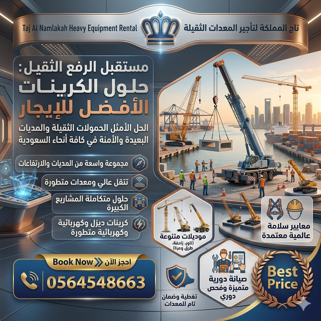 🏗️🏗️ تاج المملكة لتأجير المعدات الثقيلة والخفيفة ☎ 0564548663 🏗️🏗️ | كرينات للإيجار في الدمام السعودية | كرينات للإيجار في الرياض | كرين للإيجار في جدة | كرينات للإيجار في الجبيل | كرينات للإيجار في الخبر | كرينات للإيجار في القطيف | كرينات للإيجار في تبوك | نقدم حلول احترافية ومتكاملة في تأجير الرافعات الثقيلة Cranes لجميع المشاريع الإنشائية والصناعية ومواقع البناء والمصانع والمستودعات في المملكة العربية السعودية، مع معدات حديثة ومجهزة بأحدث تقنيات الأمان لتسهيل رفع وتحميل ونقل المواد الثقي